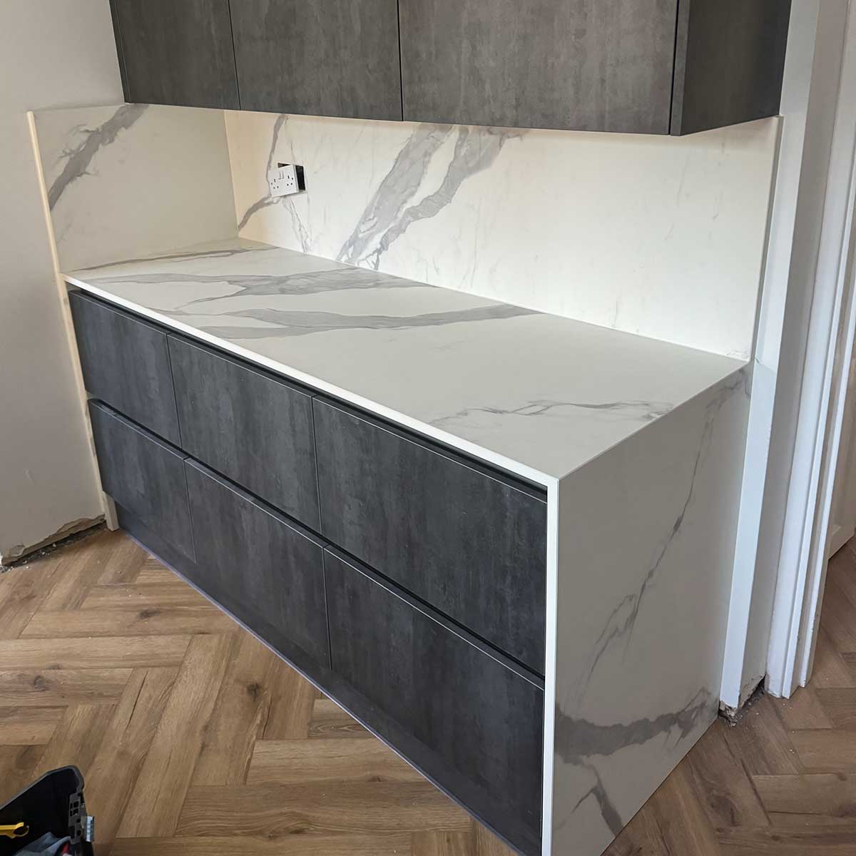 Upstands are not normally cut from the same slab as the work surfaces and therefore an exact colour match is not possible.